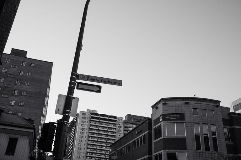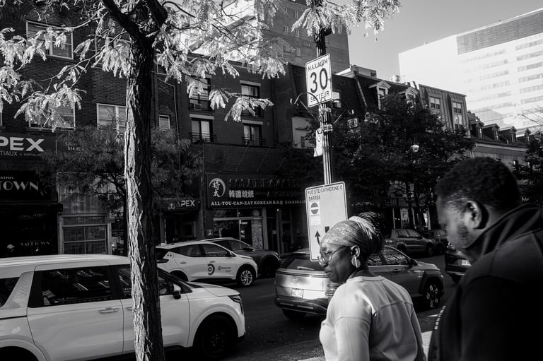 A Saturday walk on Ste-Catherine Street in Montréal — people, buildings, the vibrant feel of the city, and a stop at Manga Sushi. Captured in both color and black & white, from street life to a plane overhead. A simple slice of life, documented.