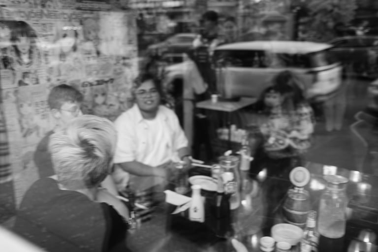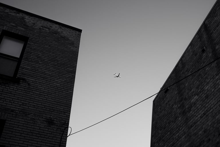 While they enjoyed their time, I decided to sit down and try the all-you-can-eat sushi myself. Between plates of rolls and miso soup, I slipped outside to capture what makes this city special—the rhythm of people walking, the planes passing above, the mix of color and black-and-white moments that feel both timeless and fleeting.
