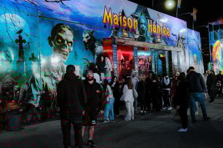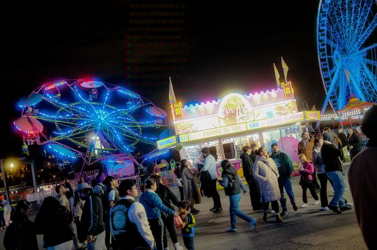 It wasn’t too cold that evening, the kind of autumn night in Montreal where you can walk comfortably without rushing for warmth. Our original plan was to park at the metro in Laval and ride down to the Old Port, but with no parking available, we decided instead to drive straight to the fairgrounds. It turned out to be the perfect choice—everything felt alive the moment we arrived.