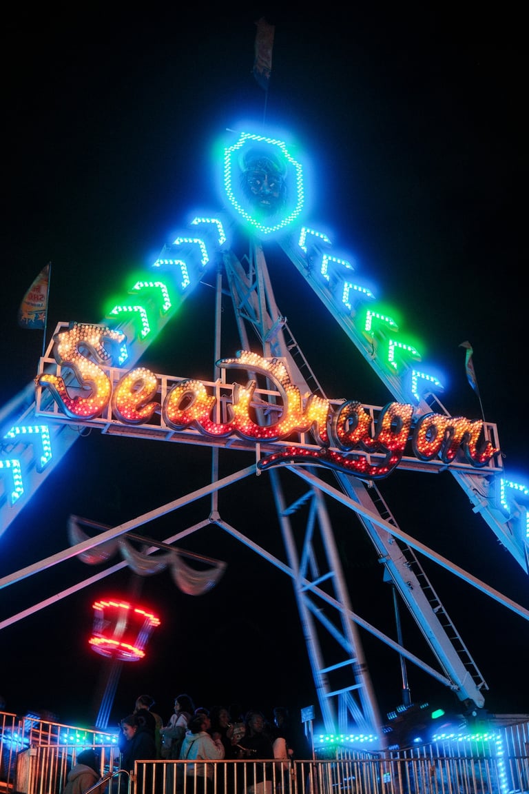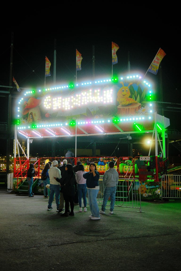 The Fall Fair at Old Port was buzzing with lights, colors, and the hum of rides cutting through the night. The kids headed straight for the Sea Dragon, while I wandered around with my Fujifilm X100VI, fitted with a black mist filter. Shooting straight out of camera, I wanted to capture the glow of neon rides, the blur of movement, and the soft haze around the bright lights.