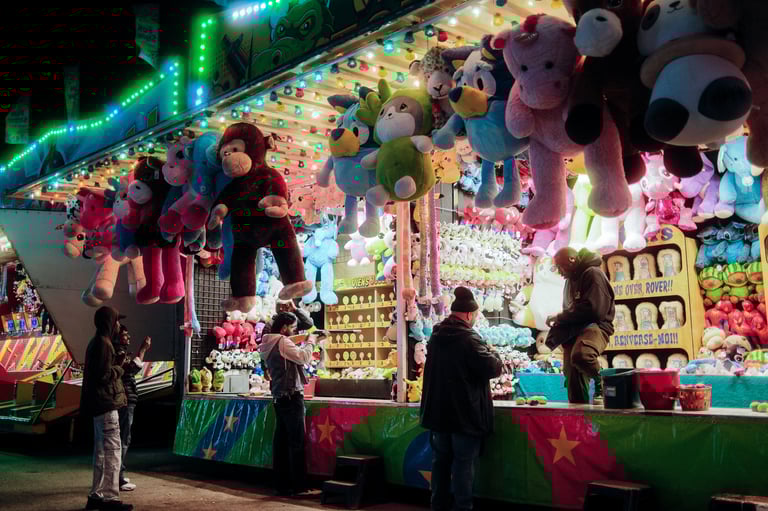 The rides lit up the night sky in every shade—green, red, yellow—and shadows fell across faces, food stalls, and game booths. From stuffed animals hanging overhead to the glowing lines of roller rides slicing the darkness, it was a playground for both kids and photographers.